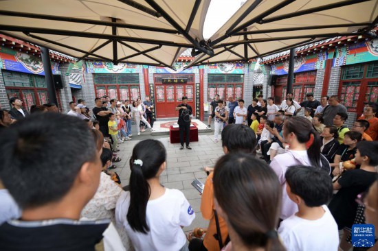 8月12日,在河北省滄州市吳橋雜技大世界景區(qū)江湖文化城,游客們觀看雜技藝人表演傳統(tǒng)雜技節(jié)目。