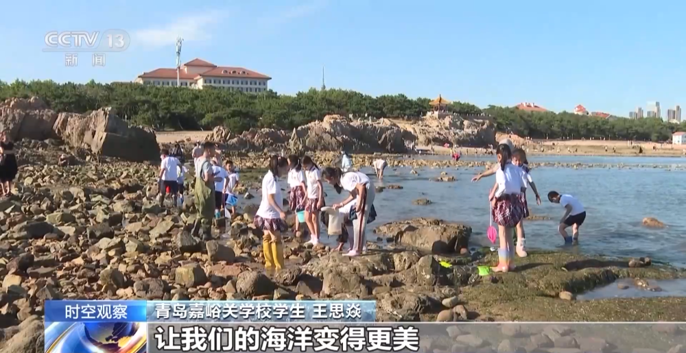 在青島第二海水浴場,中國海洋科學研究所的科研人員帶領著研學團的學生在海洋潮間帶認識、采集海藻。隨后孩子們在老師指導下對藻類進行鑒定、清洗、制作藻類臘葉標本,聽專家科普海洋知識。