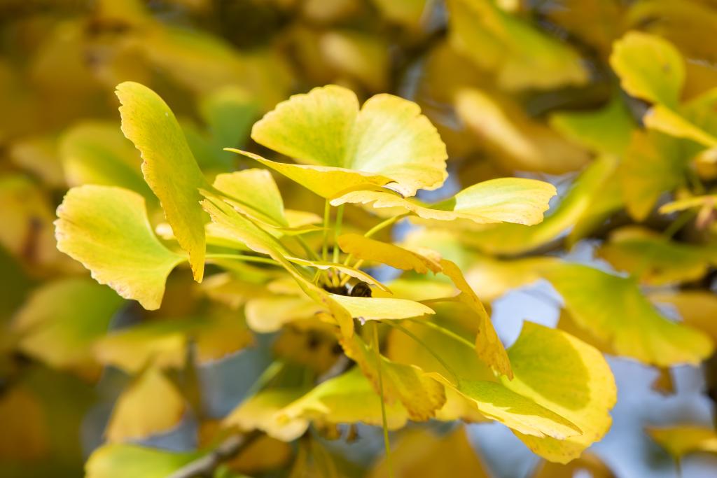 在甘肅省隴南市徽縣嘉陵鎮(zhèn)田河村,古銀杏樹葉呈現(xiàn)黃綠漸變色(10月20日攝)。