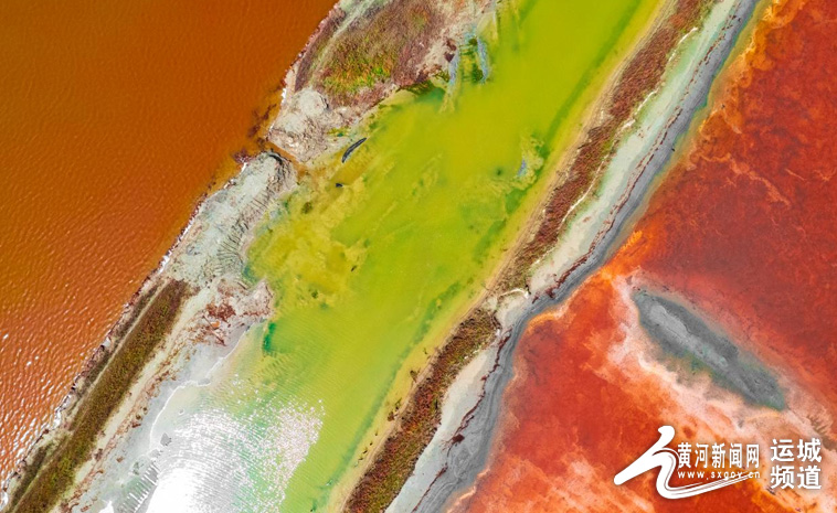 4月14日無人機(jī)拍攝的山西運城鹽湖。近日,隨著氣溫不斷升高,山西運城鹽湖呈現(xiàn)五彩斑斕的景象,美不勝收。