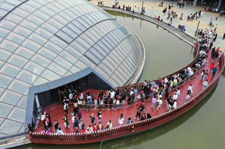 太原市植物園網(wǎng)紅電梯頂臺(tái),游客登高望遠(yuǎn)。