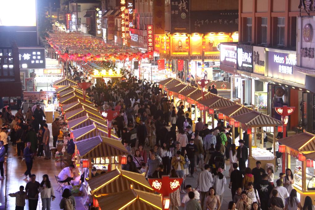 5月3日晚,游客在甘肅省敦煌市游覽夜市。新華社發(fā)(張曉亮攝)
