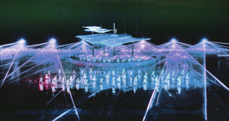 在這場(chǎng)演出中,最令人驚嘆的當(dāng)數(shù)傳統(tǒng)文化與現(xiàn)代科技的完美融合?!度鐗?mèng)晉陽(yáng)》演出設(shè)備島造型由大量不銹鋼鋼管經(jīng)過(guò)設(shè)計(jì)、再加工拼接而成,整體形成“山”的造型,好似坐落于湖中心的小島。面積高達(dá)182米×82米的全水下噴泉矩陣、2000多束璀璨燈光,配合前方的直流、對(duì)拱、扇形水幕,連同后方80米×19米網(wǎng)幕形成的視覺(jué)矩陣投影,展現(xiàn)出宏大的山景古城畫(huà)面。這些畫(huà)面栩栩如生,將晉陽(yáng)古城的歷史變遷、文化傳承一一展現(xiàn)在觀眾眼前,讓人仿佛置身于歷史的長(zhǎng)河之中,親身感受著晉陽(yáng)的興衰榮辱。