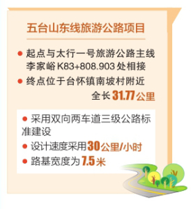 五臺(tái)山東線旅游公路起點(diǎn)與太行一號(hào)旅游公路主線李家峪K83+ 808.903處相接,終點(diǎn)位于臺(tái)懷鎮(zhèn)南坡村附近,全長31.77公里,采用雙向兩車道三級(jí)公路標(biāo)準(zhǔn)建設(shè),設(shè)計(jì)速度采用30公里/小時(shí),路基寬度為7.5米。項(xiàng)目實(shí)施圍繞“扶貧、旅游、生態(tài)、人文、研學(xué)”等核心宗旨,著力提升五臺(tái)山風(fēng)景名勝區(qū)旅游公路的通行能力與服務(wù)水平,強(qiáng)化“交通+旅游”與“經(jīng)濟(jì)增長”的導(dǎo)向作用。