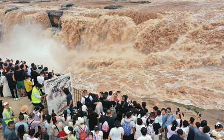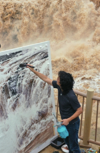 8月10日,一名畫家在吉縣黃河壺口瀑布景區(qū)現(xiàn)場(chǎng)創(chuàng)作(左圖)。連日來(lái),吉縣黃河壺口瀑布水量持續(xù)增大,形成壯美瀑布群景觀,奔騰咆哮的雄姿吸引了眾多書畫愛好者前來(lái)創(chuàng)作。