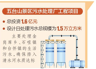 五臺山景區(qū)污水處理廠工程項目總投資1.6億元,設(shè)計日處理污水總規(guī)模為1.5萬立方米,主要處理金崗庫鄉(xiāng)、石咀鎮(zhèn)和臺懷鎮(zhèn)的生活污水,確保排入清水河水質(zhì)達標。