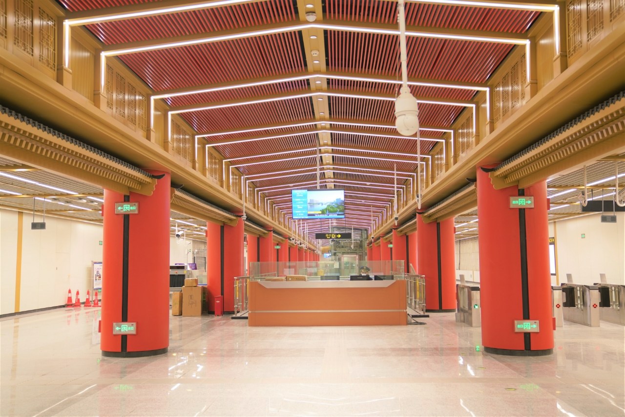 不止于此,太原地鐵2號(hào)線每一個(gè)站點(diǎn),都隱藏著設(shè)計(jì)師的巧思妙想。北大街站天藍(lán)色的線條流暢得像條河,串著山西從古至今的故事,也串著山西與世界的相遇;府西街站的屋脊造型,是從山西古建中“搬”來的,翹角的弧度里藏著匠人的心思;晉陽街站的墻面印著晉商大院的磚雕,一磚一瓦都透著當(dāng)年晉商走西口的豪邁;龍城大街站的屋檐,分明是五臺(tái)山延慶寺大殿的模樣,抬頭看時(shí),仿佛能聽見古寺的鐘聲。