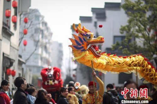 2015年農(nóng)歷二月初二,民間舞龍隊在南京城南老街舞龍。泱波 攝