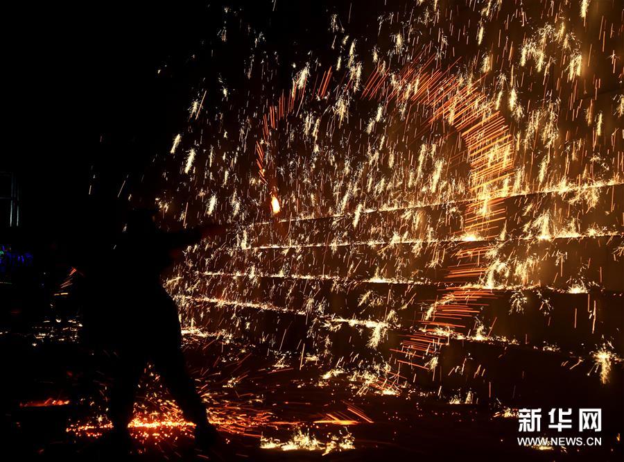 1月12日,河北磁縣開始舉行“打鐵花”慶新年活動?!按蜩F花”是以小煉鐵爐將生鐵化成鐵水后,用木板將鐵水加鋸末打上天空,鋸末在空中燃燒形成“鐵花火雨”四濺飛揚的景象。打鐵花”是當(dāng)?shù)貧v史悠久的民俗娛樂活動。新華社發(fā) (趙鴻宇 攝)
