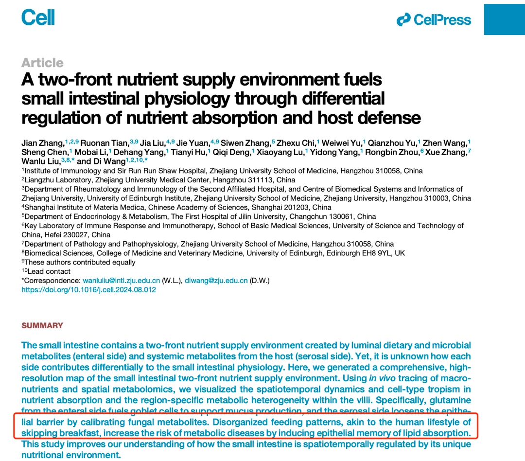 日前,浙江大學(xué)醫(yī)學(xué)院附屬邵逸夫醫(yī)院、浙江大學(xué)愛丁堡大學(xué)聯(lián)合學(xué)院、中國科學(xué)院上海藥物研究所的研究團(tuán)隊(duì),在頂尖學(xué)術(shù)期刊《細(xì)胞》(Cell)上合作發(fā)表一篇論文表明,不吃早餐的這種飲食習(xí)慣會(huì)改變小腸對(duì)營養(yǎng)物質(zhì)的吸收方式,從而會(huì)增加代謝性疾病的風(fēng)險(xiǎn)。