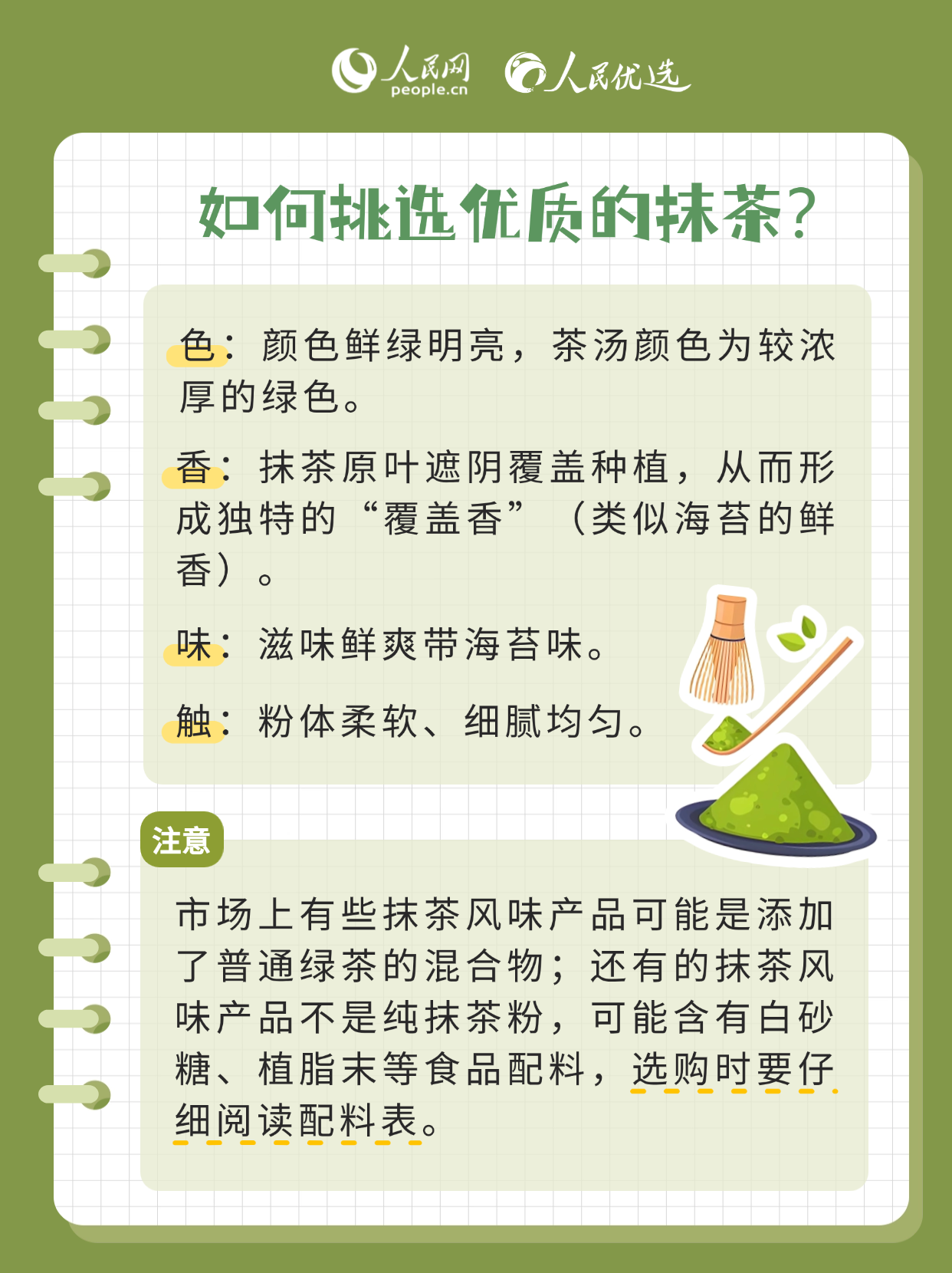 抹茶因香氣獨(dú)特、口感層次豐富、色澤翠綠悅目,受到很多人的喜愛。市面上抹茶冰淇淋、抹茶蛋糕、抹茶飲品等各種抹茶風(fēng)味制品層出不窮。抹茶到底是什么茶?選購(gòu)抹茶應(yīng)留意什么?本期《人民優(yōu)選來了》,帶您讀懂這抹綠。