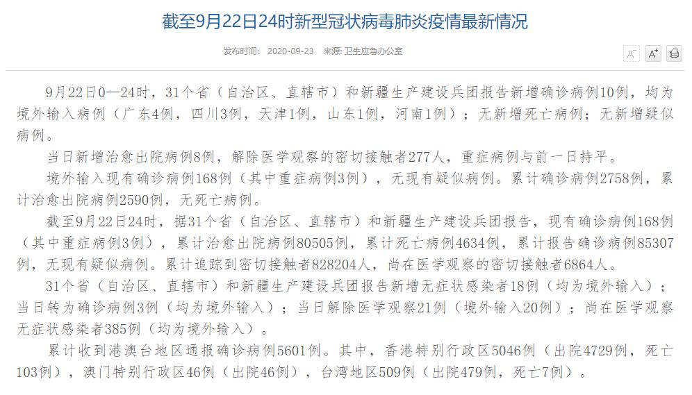 人民網(wǎng)北京9月23日電(董童)國家衛(wèi)生健康委于今日在官網(wǎng)發(fā)布的《截至9月22日24時(shí)新型冠狀病毒肺炎疫情最新情況》(以下簡稱“情況”)提出,9月22日0—24時(shí),31個?。ㄗ灾螀^(qū)、直轄市)和新疆生產(chǎn)建設(shè)兵團(tuán)報(bào)告新增確診病例10例,均為境外輸入病例(廣東4例,四川3例,天津1例,山東1例,河南1例);無新增死亡病例;無新增疑似病例。當(dāng)日新增治愈出院病例8例,解除醫(yī)學(xué)觀察的密切接觸者277人,重癥病例與前一日持平。