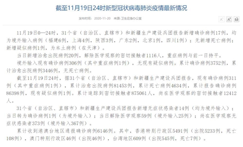 人民網(wǎng)北京11月20日電(董童)國(guó)家衛(wèi)生健康委于今日在官網(wǎng)發(fā)布的《截至11月19日24時(shí)新型冠狀病毒肺炎疫情最新情況》(以下簡(jiǎn)稱“情況”)提出,11月19日0—24時(shí),31個(gè)省(自治區(qū)、直轄市)和新疆生產(chǎn)建設(shè)兵團(tuán)報(bào)告新增確診病例17例,均為境外輸入病例(福建6例,上海4例,陜西3例,廣東2例,北京1例,四川1例);無(wú)新增死亡病例;新增疑似病例1例,為本土病例(在天津)。當(dāng)日新增治愈出院病例20例,解除醫(yī)學(xué)觀察的密切接觸者1116人,重癥病例與前一日持平。