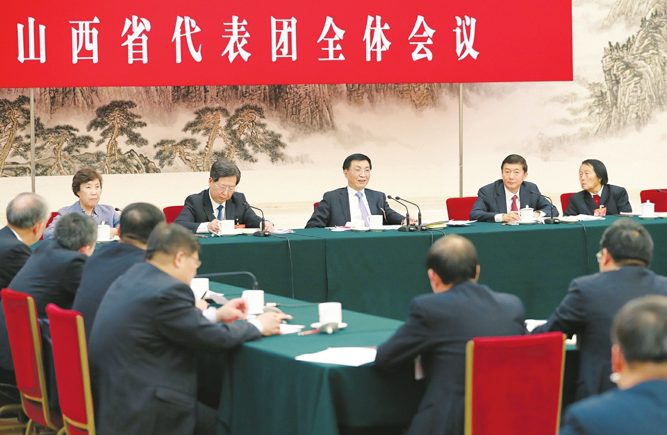 楊景海、鄭連生、申紀蘭、劉正、董林、楊蓉、賈樟柯、李桂琴、郭鳳蓮、姜四清代表先后就“兩高”工作報告、攻堅深度貧困、堅持和發(fā)展人民代表大會制度、外商投資法、煤炭減優(yōu)綠給礦工帶來了好日子、掃黑除惡讓老百姓感到更放心、在山西小城搭建世界文化舞臺、踐行新聞工作者“四力”、大寨走進新時代、實現(xiàn)煤老大到能源革命排頭兵歷史跨越進行發(fā)言。