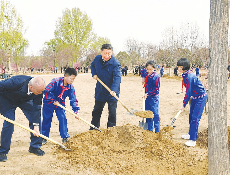 4月8日,黨和國(guó)家領(lǐng)導(dǎo)人習(xí)近平、栗戰(zhàn)書(shū)、汪洋、王滬寧、趙樂(lè)際、韓正、王岐山等來(lái)到北京市通州區(qū)永順鎮(zhèn)參加首都義務(wù)植樹(shù)活動(dòng)。這是習(xí)近平同大家一起植樹(shù)。 新華社記者謝環(huán)馳攝