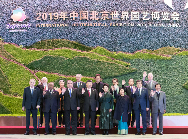 4月28日,國(guó)家主席習(xí)近平在北京延慶出席2019年中國(guó)北京世界園藝博覽會(huì)開(kāi)幕式,并發(fā)表題為《共謀綠色生活,共建美麗家園》的重要講話。這是開(kāi)幕式前,習(xí)近平和夫人彭麗媛同參加開(kāi)幕式的外方領(lǐng)導(dǎo)人集體合影。新華社記者 黃敬文 攝