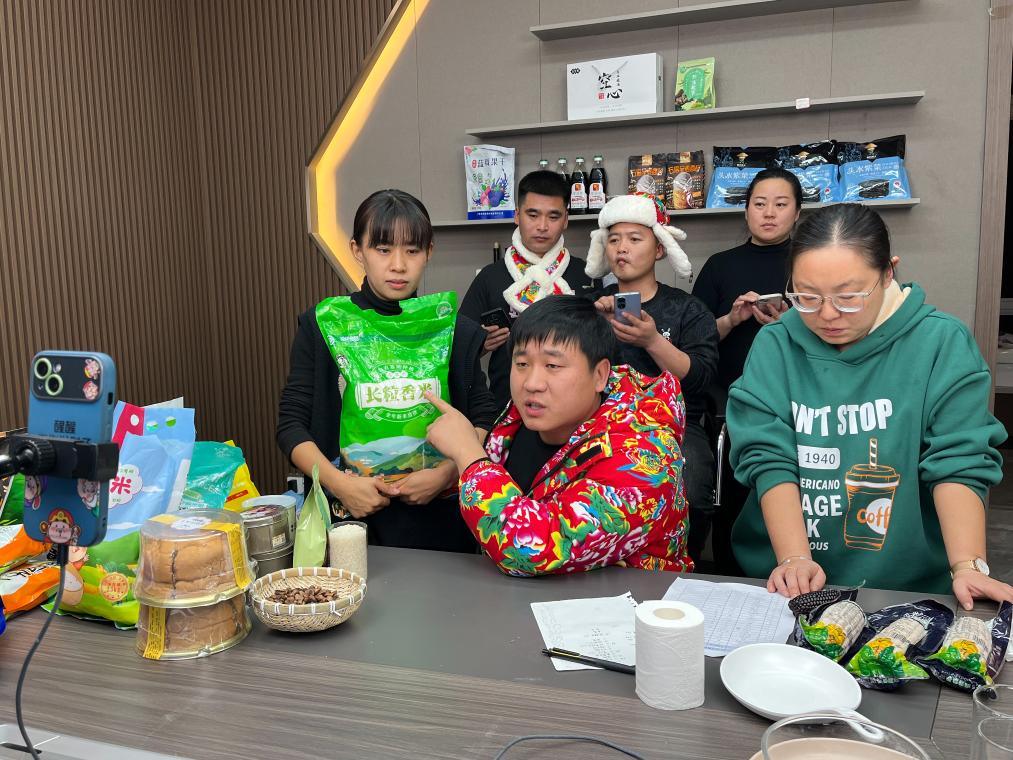 2023年12月15日,盧戰(zhàn)開(kāi)(前排中間)在直播銷售大米。(受訪者供圖)