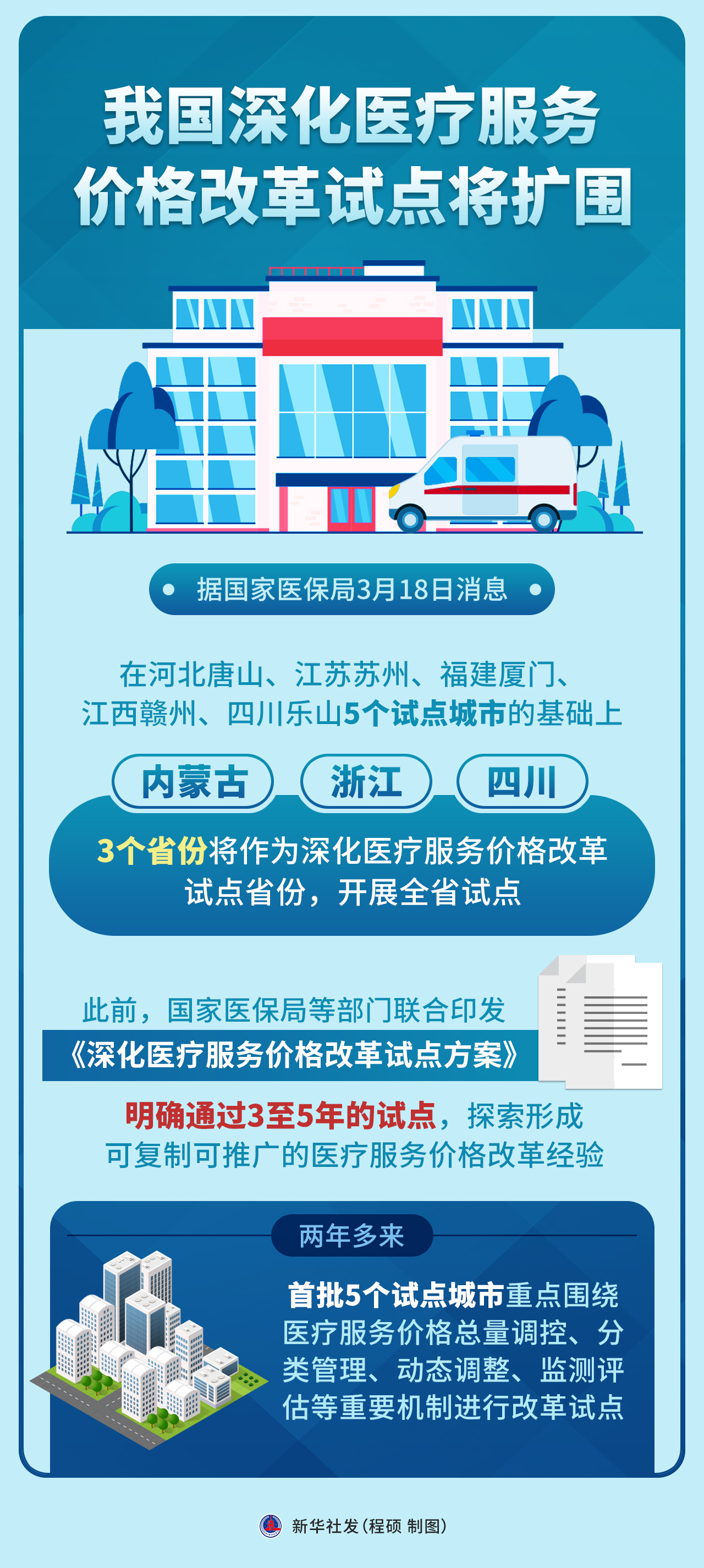 此前,國(guó)家醫(yī)保局等部門(mén)聯(lián)合印發(fā)《深化醫(yī)療服務(wù)價(jià)格改革試點(diǎn)方案》,明確通過(guò)3至5年的試點(diǎn),探索形成可復(fù)制可推廣的醫(yī)療服務(wù)價(jià)格改革經(jīng)驗(yàn)。兩年多來(lái),首批5個(gè)試點(diǎn)城市重點(diǎn)圍繞醫(yī)療服務(wù)價(jià)格總量調(diào)控、分類(lèi)管理、動(dòng)態(tài)調(diào)整、監(jiān)測(cè)評(píng)估等重要機(jī)制進(jìn)行改革試點(diǎn)。