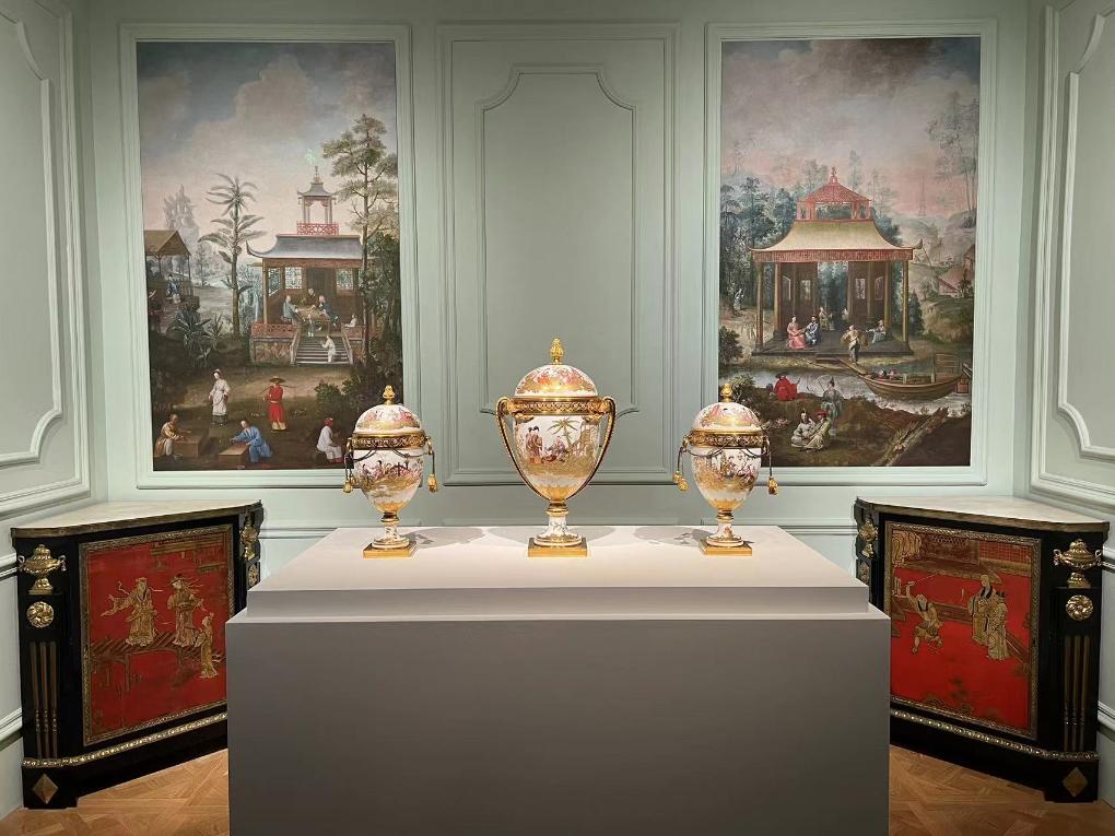 展廳正中,復(fù)刻路易十五王后瑪麗·萊什琴斯卡私人房間“中國人廳”的展陳精致非常。繪制中國人物形象的法國產(chǎn)瓷瓶、鑲嵌了中國漆版的墻角柜,正無聲訴說著當(dāng)年法國貴族們對(duì)中國藝術(shù)的追捧和熱愛。