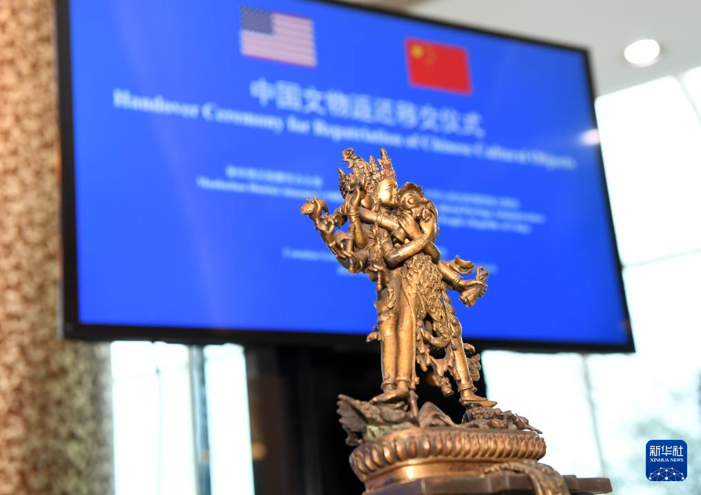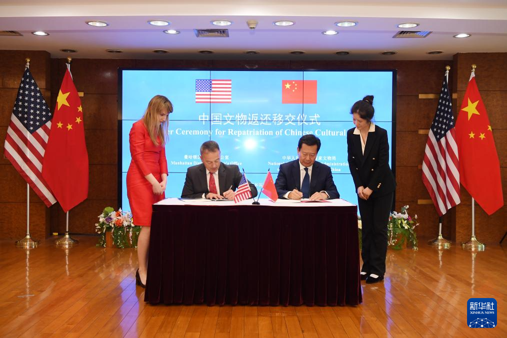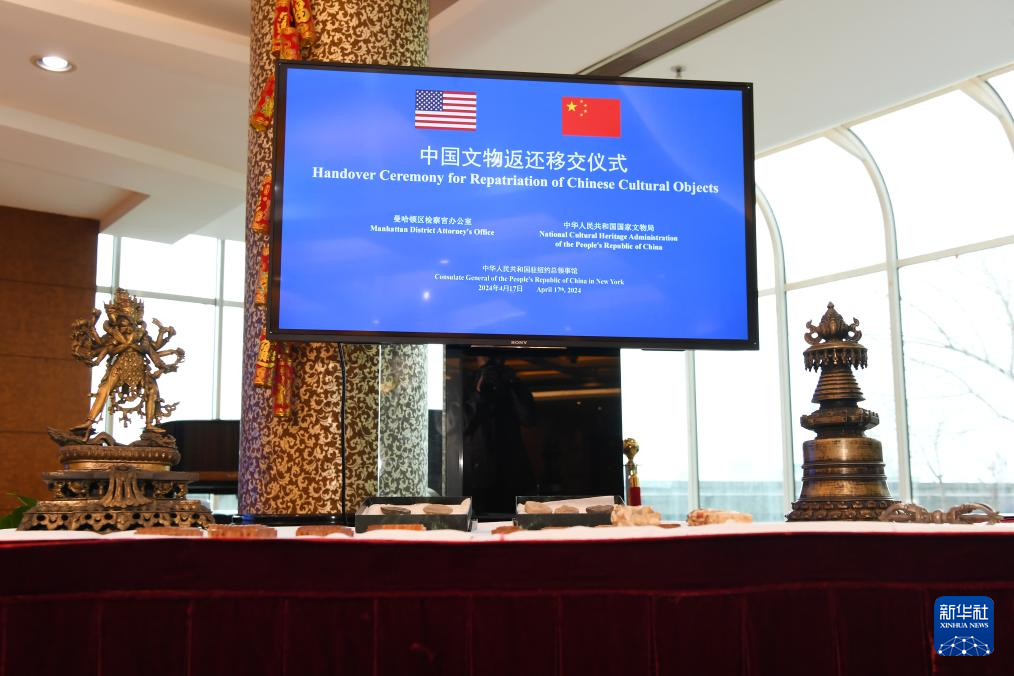 4月17日,在美國(guó)紐約中國(guó)駐紐約總領(lǐng)館,中美雙方代表出席中國(guó)流失文物藝術(shù)品返還移交儀式。新華社記者 李睿 攝