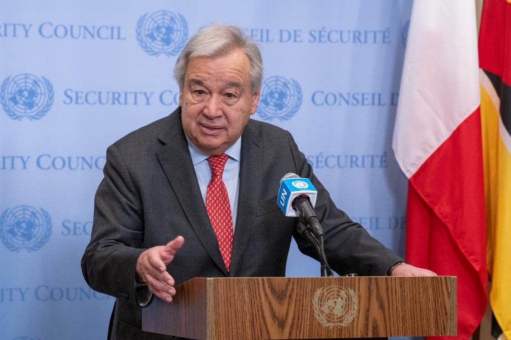 4月5日,在位于紐約的聯合國總部,聯合國秘書長古特雷斯舉行記者見面會。新華社發(fā)(聯合國供圖/埃瑟金德爾·德貝貝攝)
