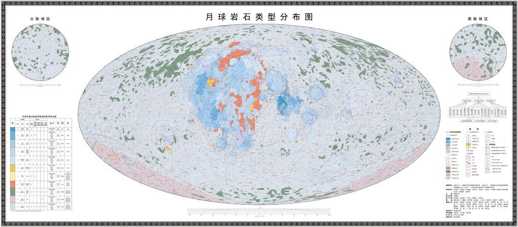 在主圖上,可以看到全月12341個撞擊坑、81個撞擊盆地,辨別出17種巖石類型、14類構(gòu)造。人類探測器著陸點、特殊高程點等一些特殊要素,在圖集中也有顯示。