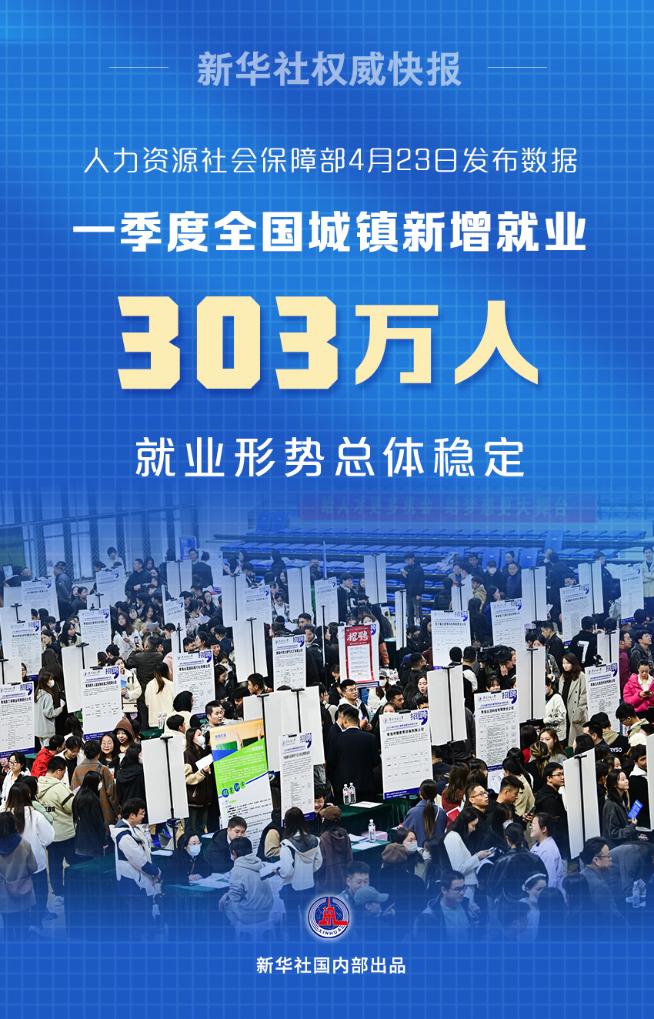 人力資源和社會保障部4月23日發(fā)布數(shù)據(jù),一季度全國城鎮(zhèn)新增就業(yè)303萬人。按照今年“1200萬人以上”的城鎮(zhèn)新增就業(yè)目標(biāo),一季度已完成全年任務(wù)的四分之一。3月份全國城鎮(zhèn)調(diào)查失業(yè)率5.2%,就業(yè)形勢總體穩(wěn)定。