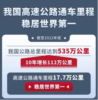1999年,“黃金周”這個(gè)概念第一次出現(xiàn)在大眾視野里,在那一年,全國高速公路通車?yán)锍虅偼黄?萬公里。截至2022年底,我國公路總里程達(dá)到535萬公里,其中高速公路通車?yán)锍?7.7萬公里,穩(wěn)居世界第一。