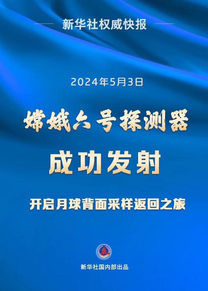 新華社海南文昌5月3日電 5月3日17時27分,嫦娥六號探測器由長征五號遙八運載火箭在中國文昌航天發(fā)射場成功發(fā)射,之后準(zhǔn)確進(jìn)入地月轉(zhuǎn)移軌道,由此開啟世界首次月背“挖寶”之旅。