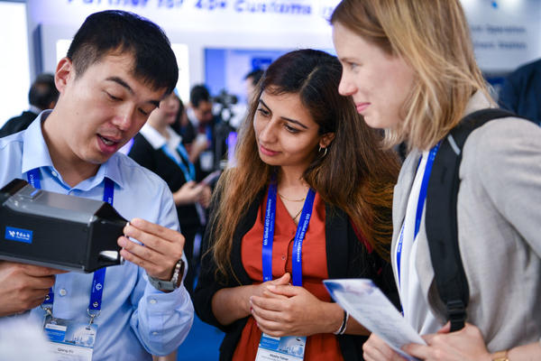 5月8日,嘉賓在第六屆全球AEO大會中國海關(guān)展臺了解手持式再生金屬分析儀。新華社記者 梁旭 攝