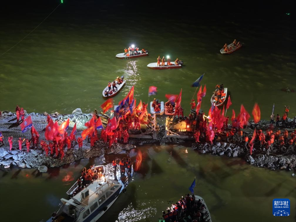 這是7月8日晚拍攝的團(tuán)洲垸洞庭湖大堤決口封堵現(xiàn)場(chǎng)(無(wú)人機(jī)照片)。新華社記者 陳思汗 攝