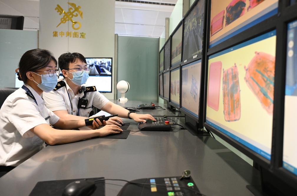 2024年7月18日,在北京大興國(guó)際機(jī)場(chǎng),北京海關(guān)工作人員通過(guò)行李先期機(jī)檢系統(tǒng)對(duì)旅客攜帶物進(jìn)行查驗(yàn)。通過(guò)不斷前置的行李機(jī)檢工作,旅客行李物品監(jiān)管效率大幅提升。新華社記者 李賀 攝