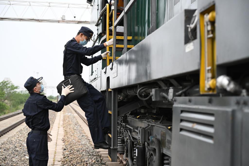 2024年7月17日,兩名滿洲里海關(guān)工作人員登上一列停靠在內(nèi)蒙古滿洲里鐵路口岸的中歐班列貨運(yùn)列車檢查。新華社記者 李賀 攝