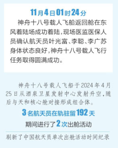 神舟十八號(hào)載人飛船于2024年4月25日從酒泉衛(wèi)星發(fā)射中心發(fā)射升空,隨后與天和核心艙對接形成組合體。3名航天員在軌駐留192天,期間進(jìn)行了2次出艙活動(dòng),刷新了中國航天員單次出艙活動(dòng)時(shí)間紀(jì)錄,完成空間站空間碎片防護(hù)裝置安裝和多次貨物出艙任務(wù),先后開展了艙內(nèi)外設(shè)備安裝、調(diào)試、維護(hù)維修等各項(xiàng)工作,為空間站長期穩(wěn)定在軌運(yùn)行進(jìn)一步積累了寶貴的數(shù)據(jù)和經(jīng)驗(yàn);同時(shí),還在地面科研人員密切配合下,完成了涉及微重力基礎(chǔ)物理、空間材料科學(xué)、空間生命科學(xué)、航天醫(yī)學(xué)、航天技術(shù)等領(lǐng)域的大量空間科學(xué)實(shí)(試)驗(yàn)。