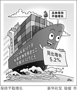 據(jù)新華社電 海關(guān)總署7日發(fā)布數(shù)據(jù)顯示,2024年前10個(gè)月,我國貨物貿(mào)易進(jìn)出口總值36.02萬億元,同比增長5.2%,總體保持平穩(wěn)增長。