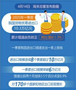 14日,海關(guān)總署發(fā)布數(shù)據(jù):今年一季度,我國貨物貿(mào)易進出口10.3萬億元,累計增速由負(fù)轉(zhuǎn)正,同比增長1.3%;月度增速逐漸回暖,從1月份同比下降2.2%,到2月份基本持平,再到3月份增長6%,一季度我國進出口增速走出一條上揚線。