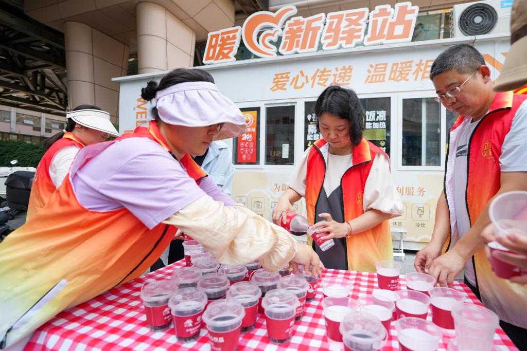6月25日,在北京市東城區(qū)崇外街道一處“暖新驛站”外,街道工作人員在為高溫下的外賣(mài)員、快遞員準(zhǔn)備冰鎮(zhèn)飲料。新華社記者 鞠煥宗 攝