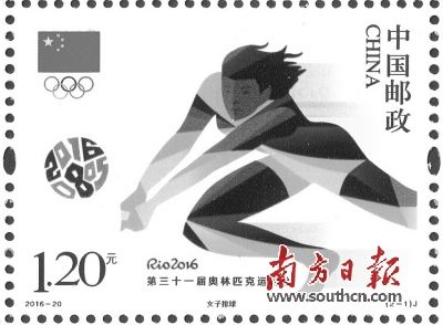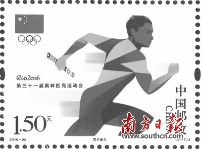 《第三十一屆奧林匹克運(yùn)動會》紀(jì)念郵票規(guī)格為40毫米×30毫米,每版20枚(10套),整版規(guī)格為240毫米×150毫米。郵票設(shè)計以中國隊比較擅長的女子排球和男子接力兩個集體項目為主要元素,整個畫面動感十足,極具中國、巴西兩國特色。