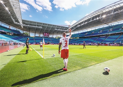 5月16日,德甲萊比錫隊球員安杰利諾準備主罰角球。新華社發(fā)