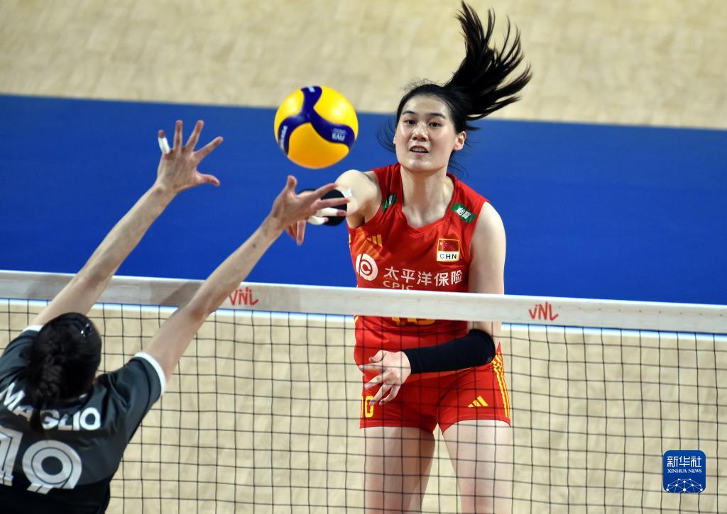 6月13日,中國隊(duì)球員袁心玥(上)在比賽中扣球。新華社記者盧炳輝攝