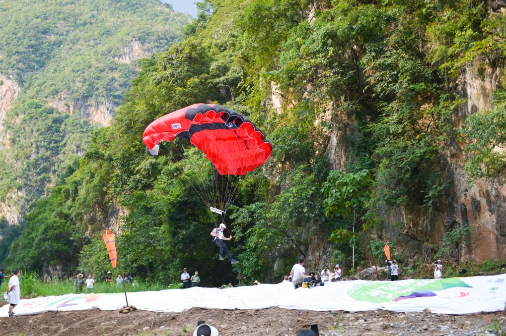 新華社貴陽(yáng)9月6日電(記者駱飛、吳思)6日上午,極限運(yùn)動(dòng)員們相繼從北盤江大橋上飛躍而下,拉開了在貴州省六盤水市舉行的2023國(guó)際高橋極限運(yùn)動(dòng)邀請(qǐng)賽世界第一高橋站低空跳傘角逐的序幕。
