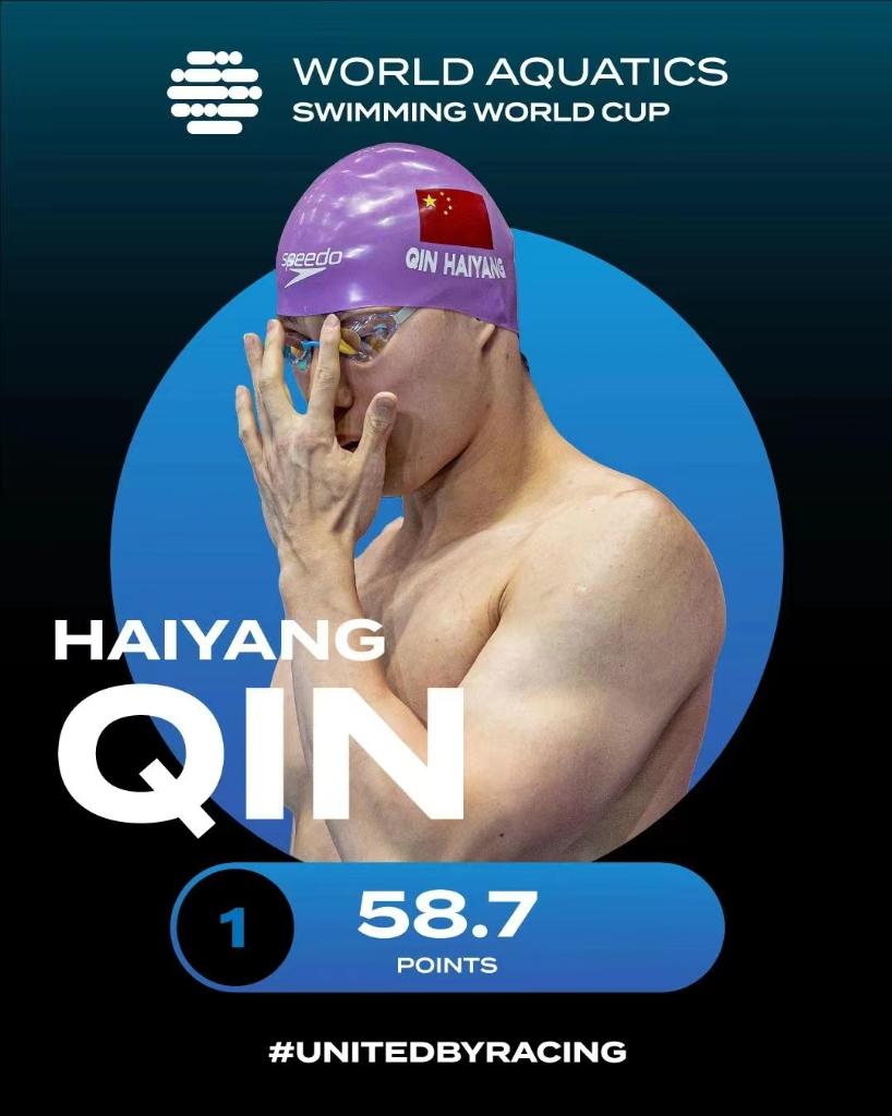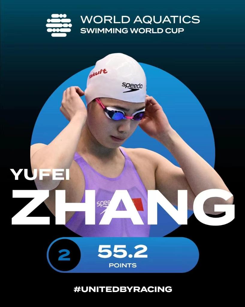 何詩蓓則以52秒02的成績改寫她9月底在杭州亞運(yùn)會創(chuàng)造的女子100米自由泳亞洲紀(jì)錄52秒17,成為該項(xiàng)目歷史上第三快的選手,她還收獲了200米自由泳金牌和400米自由泳銅牌,在積分榜列第三名。