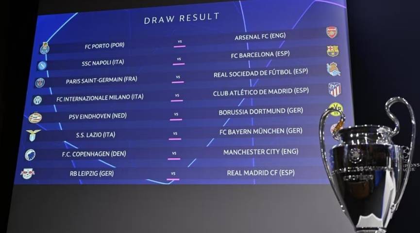 具體對(duì)陣如下:波爾圖(葡超)對(duì)陣阿森納(英超)、那不勒斯(意甲)對(duì)陣巴塞羅那(西甲)、巴黎圣日耳曼(法甲)對(duì)陣皇家社會(huì)(西甲)、國(guó)際米蘭(意甲)對(duì)陣馬德里競(jìng)技(西甲)、埃因霍溫(荷甲)對(duì)陣多特蒙德(德甲)、拉齊奧(意甲)對(duì)陣拜仁慕尼黑(德甲)、哥本哈根(丹超)對(duì)陣曼城(英超)、萊比錫(德甲)對(duì)陣皇家馬德里(西甲)。