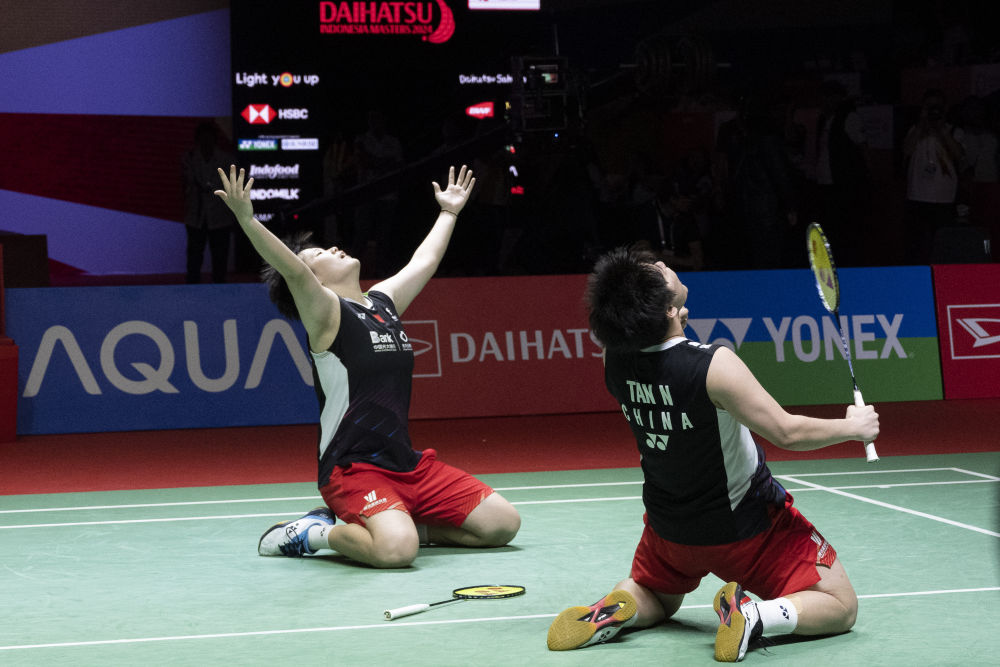 1月28日,鄭思維(右)/黃雅瓊在比賽后慶祝獲勝。新華社記者 徐欽 攝