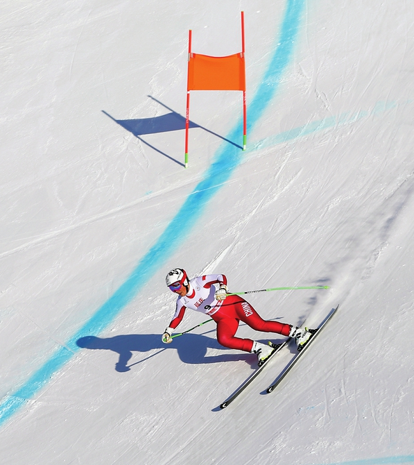高山之巔,白雪之上,滑雪運動員在落差高達547米的雪道上滑降,他們穿行、回轉(zhuǎn),快似閃電,如雪上飛燕。