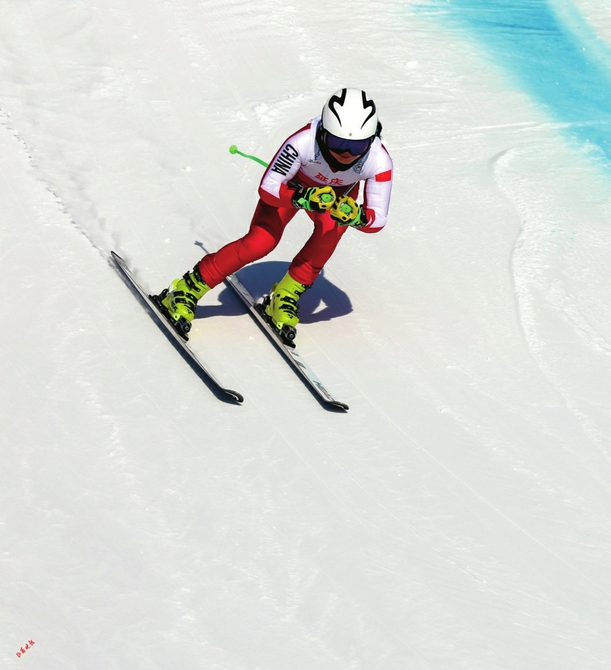 女子滑降比賽冠軍朱天慧在比賽中。山西省體育局供圖