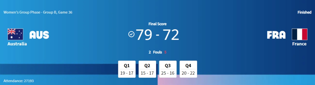 澳大利亞隊擊敗法國隊后,B組法國隊、尼日利亞隊、澳大利亞隊同為兩勝一負,攜手出線。C組排名第3的比利時隊(凈勝分0)和中國隊(凈勝分-1)同為一勝兩負,但前者凈勝分略微優(yōu)于中國隊,因此壓哨出線。中國女籃遺憾出局。