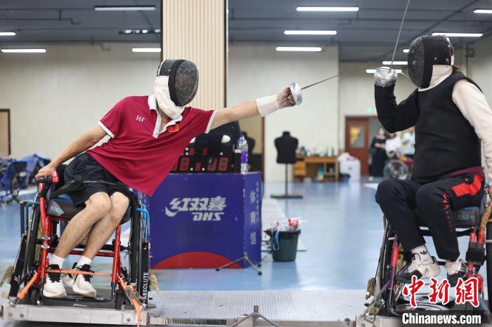 即將出征巴黎殘奧會的擊劍運動員仲賽春(左)與隊友胡道亮練習擊劍動作。中新網(wǎng)記者泱波 攝