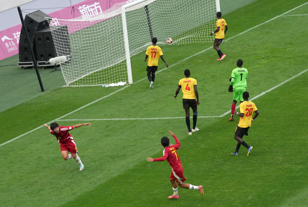 2024年5月26日,中國(guó)男子一隊(duì)球員劉誠(chéng)宇(左一)慶祝進(jìn)球。當(dāng)日,2024年國(guó)際中體聯(lián)足球世界杯賽落幕。中國(guó)男子一隊(duì)和中國(guó)女子二隊(duì)分別戰(zhàn)勝烏干達(dá)男子一隊(duì)和肯尼亞女子隊(duì),雙雙奪冠。新華社記者 李鋼 攝