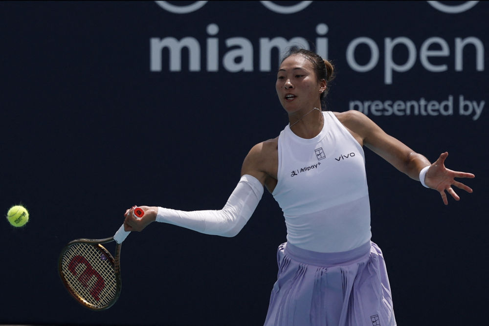 3月24日,鄭欽文在比賽中回球。新華社/路透
